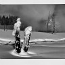 Near Miss - young skier dodges his dad on a tricky maneuver |